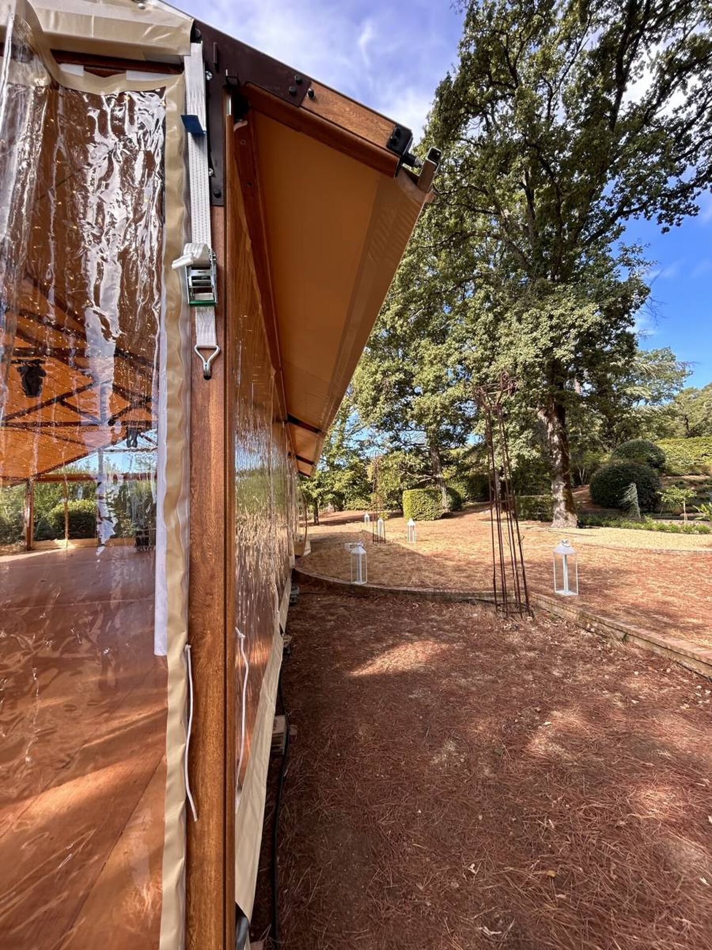 Ce chapiteau apporte une touche d'originalité grâce à son plaquage bois qui lui confère un aspect bohème et chic. Ainsi, son aspect bois unique, ses pièces métalliques noirs et marrons donnent aux événements un cachet atypique et élégant.