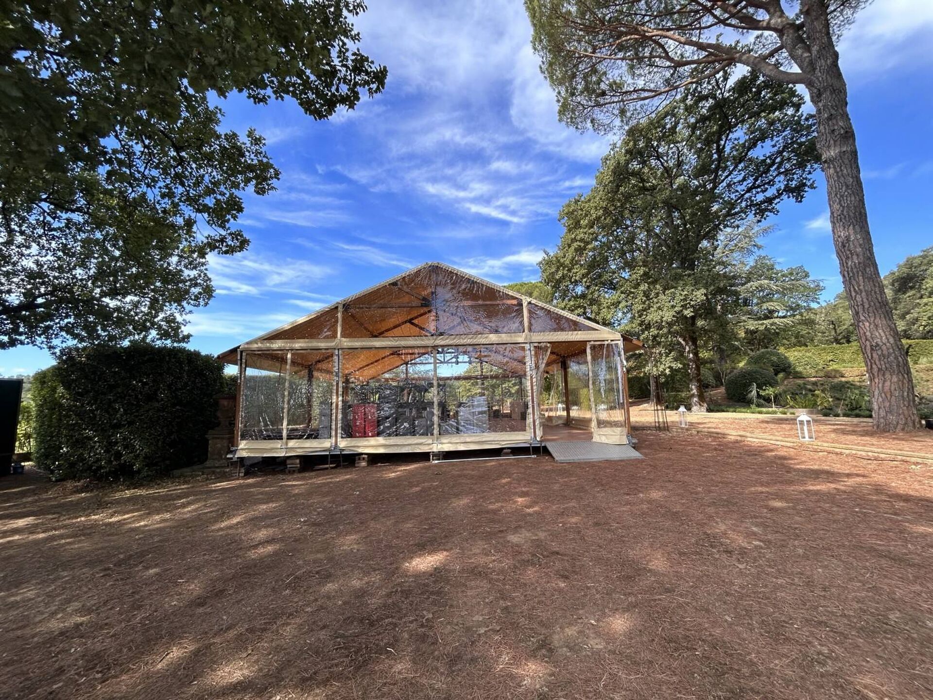 Ses murs cristal permettent luminosité et visibilité et son toit ivoire rajoute un charme supplémentaire. Enfin, son toit avancé finit de distinguer ce chapiteau si original.