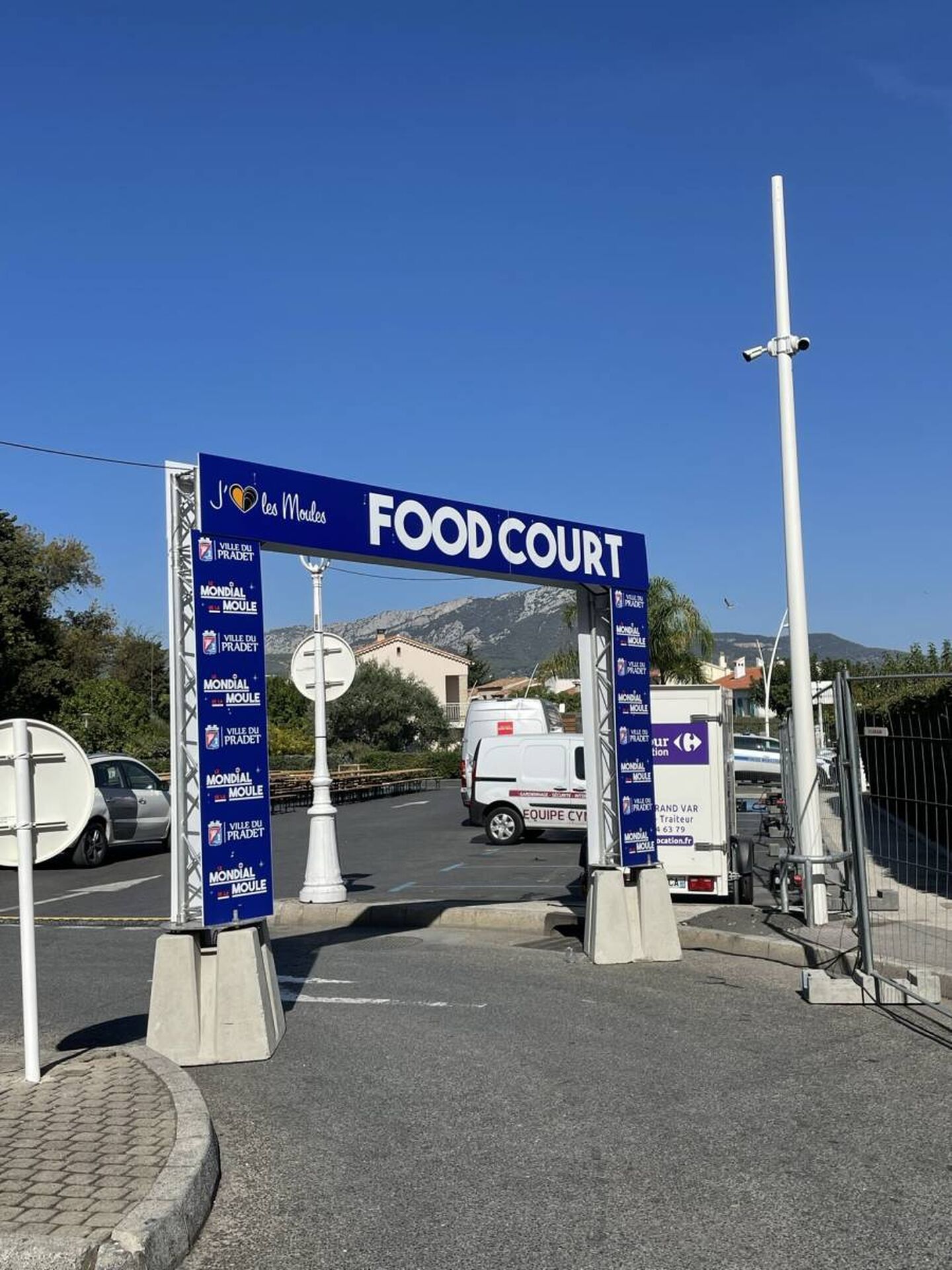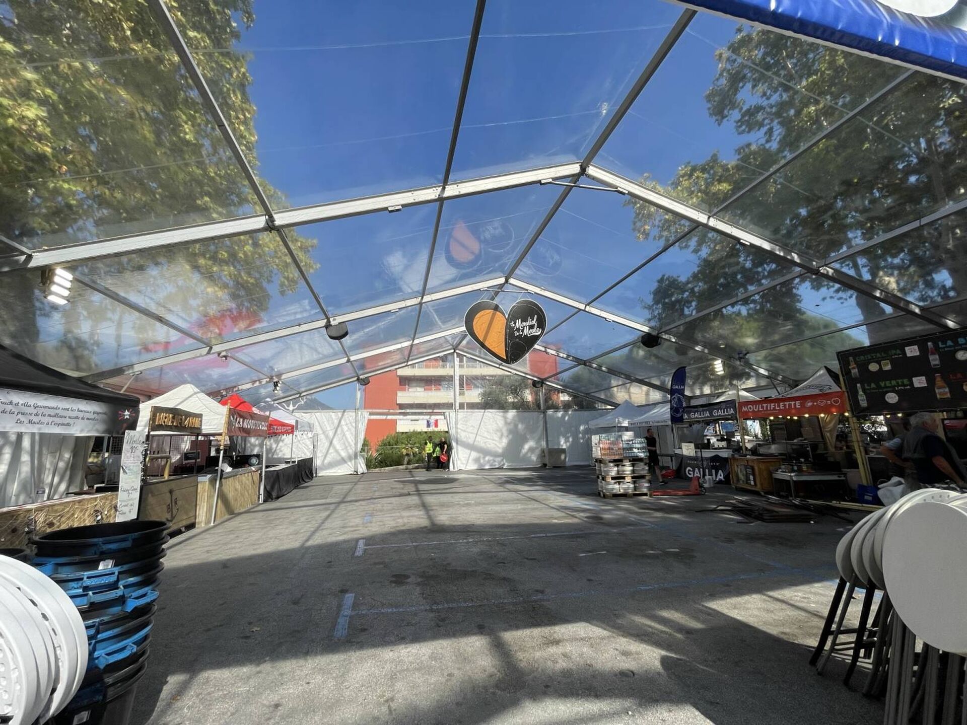 Var Chapitôt a monté une structure 20*25m sans plancher et avec des toits cristal. Le pignon est personnalisé grâce à une impression directement sur la bâche. De plus, une avancée de 20*5m permet de rester en extérieur tout en protégeant le public.